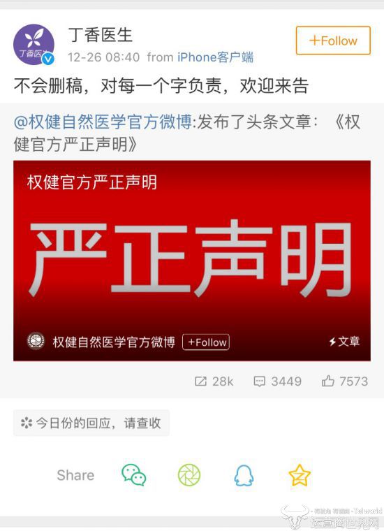 但有意思的是,随后丁香医生转发了该“严正声明”,并称,“不会删稿,对每一个字负责,欢迎来告”。不仅如此,丁香医生方面认为,权健公司的整篇声明都在说如何如何“合法”,至于公众关心的“是否有效”闭口不谈。