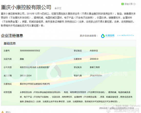 资料显示,重庆小康成立于2010年12月,主要经营范围为从事投资业务,制造、销售摩托车零部件、通用机械、电器机械及器材、电子产品、仪器仪表,销售摩托车、金属材料。同时,重庆小康还涉及房屋、机械设备租赁,商务信息咨询服务,货物进出口等业务。