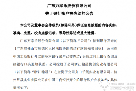 公告透露,万家乐接到银行发来的《广东省佛山市顺德区人民法院协助冻结存款通知书回执》,万家乐在中国工商银行开立的基本银行账户已被冻结。