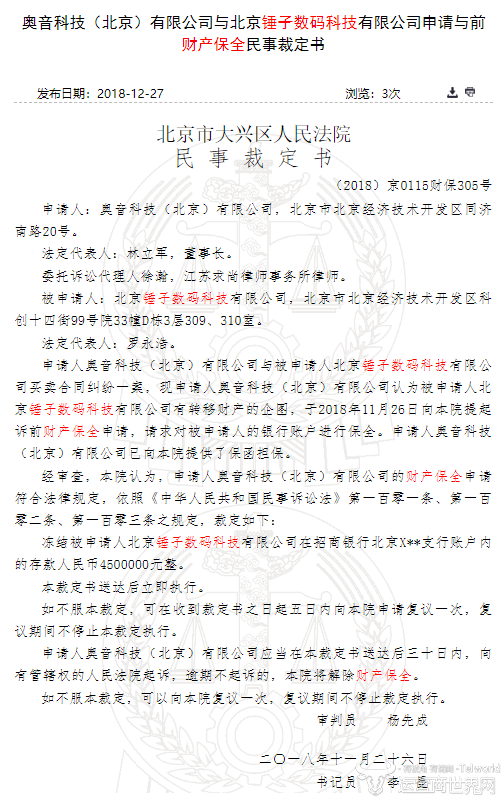 对于冻结原因,判定书显示主要系奥音科技(北京)有限公司与被申请人北京锤子数码科技有限公司存在买卖合同纠纷,而现申请人奥音科技(北京)有限公司认为被申请人北京锤子数码科技有限公司有转移财产的企图,便于2018年11月26日向北京市大兴区人民法院提起诉前财产保全申请,请求对被申请人的银行账户进行保全。