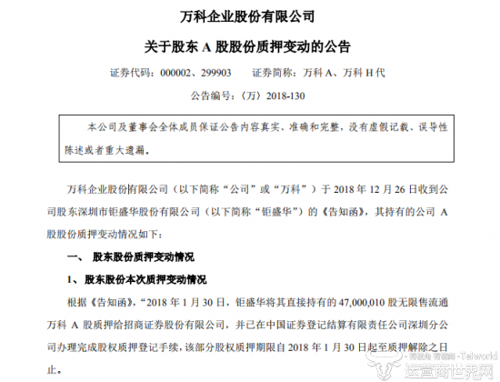 根据《告知函》透露,今年1月30日,钜盛华将其直接持有的 4700万股无限售流通万科 A 股质押给招商证券股份有限公司,并已在中国证券登记结算有限责任公司深圳分公司办理完成股权质押登记手续,该部分股权质押期限自2018年1月30日起至质押解除之日止。