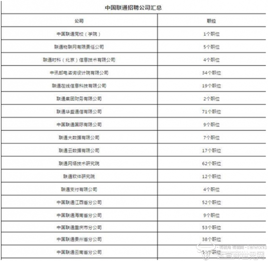 据公告显示,本次中国联通招聘共有42家分公司,1741个岗位,招聘总人数接近3000人,以下是部分招聘汇总: