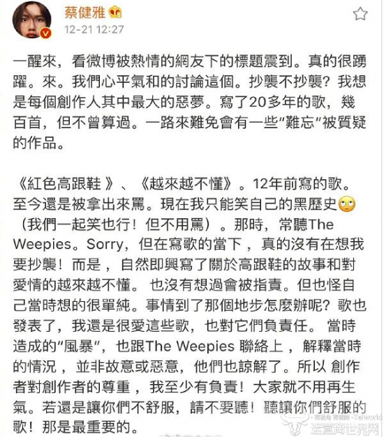 而蔡健雅日前发博文称,自己在写歌当下,真的没有在想要抄袭,抄袭不敢,不认同,也不需要。