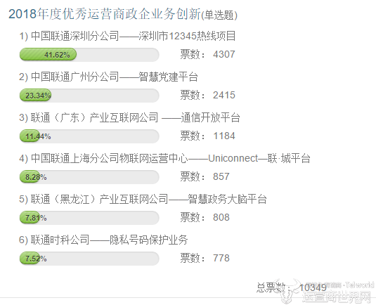 截止发稿期,在2018年度优秀运营商政企业务创新评选票量统计中,深圳联通分公司12345热线项目、广州联通分公司智慧党建平台与联通(广东)产业互联网公司的通信开放平台排名靠前,而且拉开了很大的差距,联通时科公司隐私号码保护业务垫底。