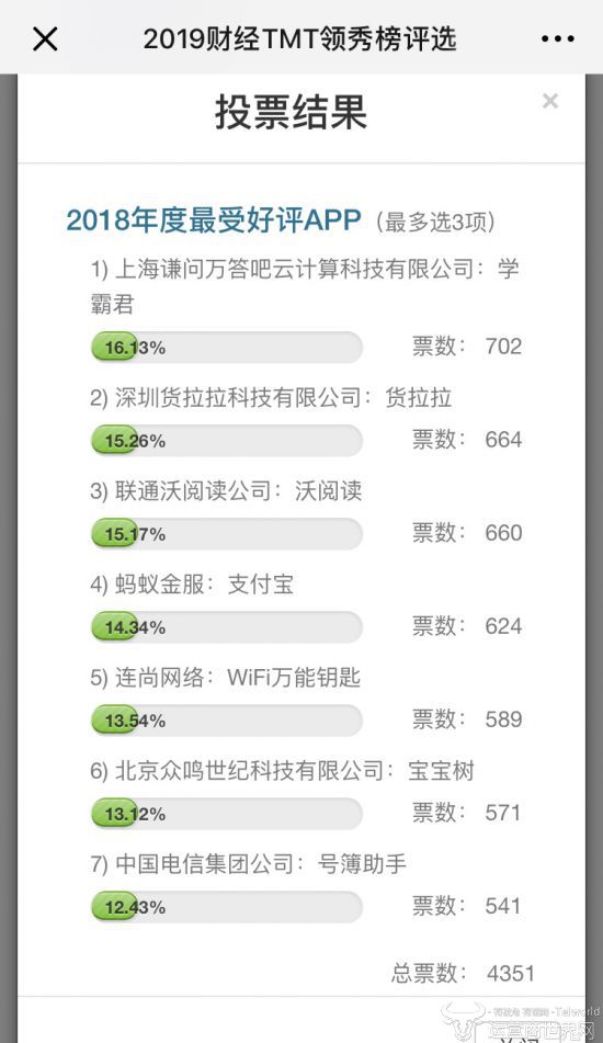 近日,运营商世界网主办的2019财经TMT行业领秀榜各项评选正在如火如荼的展开。截止今日上午,优秀互联网企业、应用APP类中,年度最受好评APP角逐异常激烈,从目前的投票环节可见,学霸君暂时以高票数领先。让人惊讶的是,支付宝仅位列第四名。