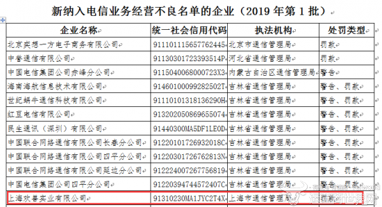 1月16日,工信部公布了2019年第一批被纳入电信业务经营不良名单的企业,共有29家企业受到警告、罚款等行政处罚,其中上海欢兽实业有限公司收到罚款处罚。