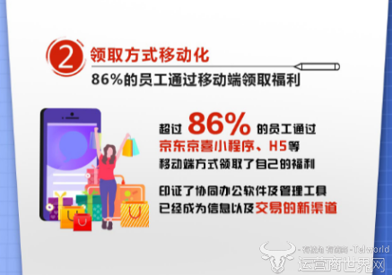 《洞察》显示,2018年通过手机端领取的福利大幅增长,超过86%的企业福利由员工通过京东京喜小程序、H5进行领取,再一次印证了协同办公软件及管理工具已经成为信息以及交易的新渠道。