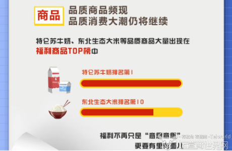 特别值得关注的是,企业员工福利品质消费趋势明显。具体来看,特仑苏牛奶、东北生态大米等品质商品分别位居福利商品TOP榜前列,其中特仑苏牛奶排名第1,东北生态大米排名第10。这意味着品质消费的消费观,在员工福利采购中充分体现。