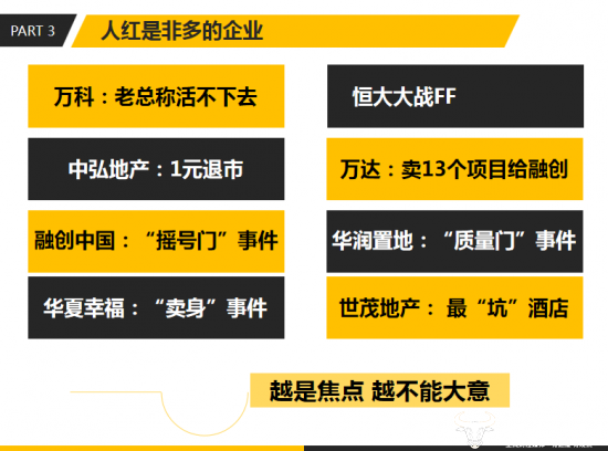 例如万科老总称活不下去、恒大大战FF、中弘地产的1元退市、万达卖13个项目给融创、融创中国的“摇号门”事件、华润置地的“质量门”事件、华夏幸福的“卖身”事件以及世茂地产的最“坑”酒店等事件纷纷被拿来做反面教材。