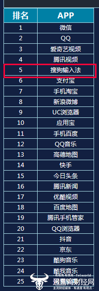 移动应用APP月活排行榜显示,进入榜单的有三款输入法,其分别是位列第五的搜狗输入法、位列三十四的讯飞输入法和四十六名的百度输入法。