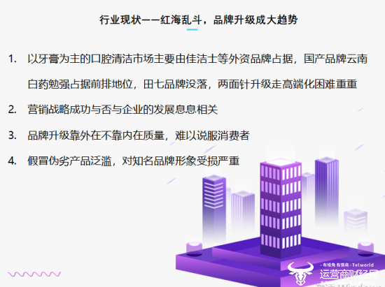 从企业层面来说,现在行业正在上演红海乱斗,品牌升级成大趋势。具体表现在以牙膏为主的口腔清洁市场主要由佳洁士等外资品牌占据,国产品牌云南白药勉强占据前排地位,田七品牌没落,两面针升级走高端化困难重重。
