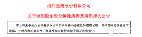 1月30日,浙江金鹰股份有限公司发布了关于控股股东股份解除质押及再质押的公告。