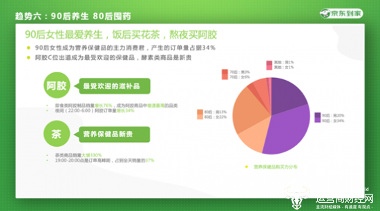 在保健类商品的购买上,90后订单量占比过半,占据平台总体单量的54%,其中90后女性用户占比34%,成为最爱养生的群体。在滋补商品的选择上,阿胶最受欢迎,尤其以即食类的阿胶增长最高,值得注意的是,夜间阿胶类商品的单量增长达到34%,可谓熬夜中不忘补气养血。花茶类商品销量大增130%,冲泡之间即可获得满满健康,倍受消费者的欢迎。
