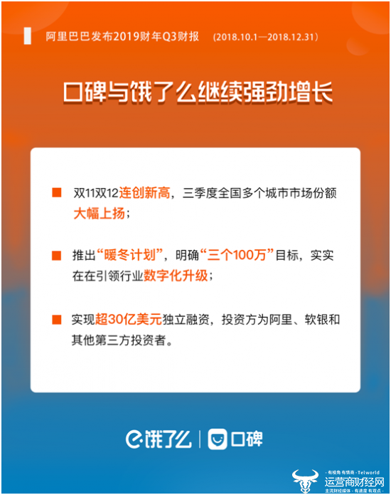 2019年1月30日,阿里巴巴发布2019财年第三季度财报。财报显示,由饿了么和口碑合并而成的阿里本地生活服务公司订单与GMV持续强劲增长,超过30亿美元的独立融资已经逐步到位。