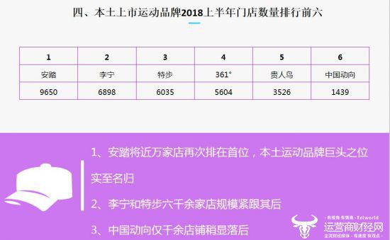 近日,运营商财经网发布了《2018年度中国消费品行业研究报告》(简称“报告”),分析了2018年一年来日化、服装及奢侈品行业的整体运行情况。在报告中,运营商财经网总结了2018年上半年本土上市运动品牌门店数量的排名,李宁与安踏之间相差近3000家。