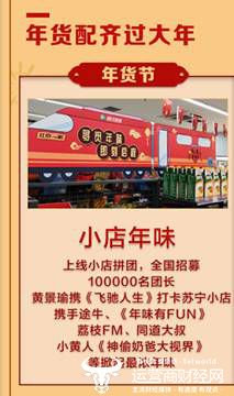 今年年货节期间,苏宁小店上线了小店拼团,在全国招募10万名团长,同时有黄景瑜携《飞驰人生》团队到小店打卡, 并与途牛、《年味有FUN》、荔枝FM、同道大叔等掀起了最浓的年味儿!