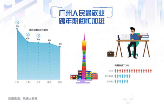 有那么一群人,在春节阖家欢聚时依旧选择坚守岗位,甘于奉献。基于联通信令数据及职驻地标签发现,在除夕夜20点至大年初一早8点间,广州市以5%的加班指数当选为全国最敬业城市,其次为上海、北京。