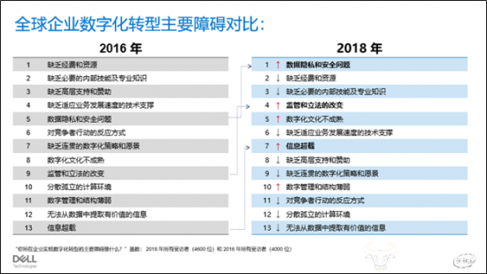 中国企业在数字化转型中所遇到的“五大障碍”与全球情况基本相同。但与“监管和立法的改变”相比,来自中国的受访者认为“缺乏适应业务发展速度的技术支撑”更应被列入其中。