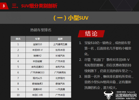 不过,小型SUV热销车型排名榜单里,除了宝骏510外,后面的排名都有所变化,在格局未稳的情况下,该板块还有重新洗牌的机会,宝骏510能不能在2019年继续稳坐冠军仍不好说。