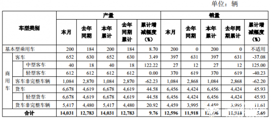 其中,基本型乘用车产量为200辆,销售200辆;商用车产量为13831辆,销售12396辆。