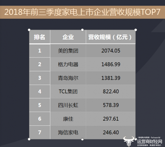 报告显示,去年前三季度营收排名前七的企业分别是美的集团、格力电器、青岛海尔 、TCL集团、四川长虹、康佳和海信家电。其中,榜单前三的营收数额分别为2074.05亿元、1486.99亿元、1381.39亿元,格力与青岛海尔差距并不是十分明显,而排名第一的美的可谓是遥遥领先。