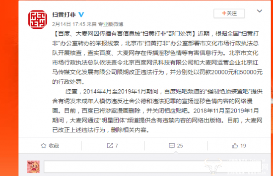 2月14日,“打黄扫非”办公室发布消息称,根据办公室专办的举报线索,北京市“扫黄打非”办公室部署市文化市场行政执法总队开展核查,查实百度、大麦网存在传播淫秽色情等有害信息行为。