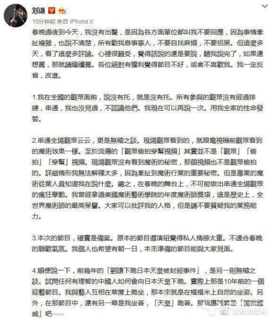 春晚每年都成为网友的吐槽对象,而最可怜的就属刘谦了吧,魔术刚表演完就被曝出视频是有人偷偷在底下换茶壶。但刚刚, 刘谦长篇回应种种质疑,称自己在表演的过程中没有托,所有参与的观众都没经过排练,甚至还用上全家性命担保。