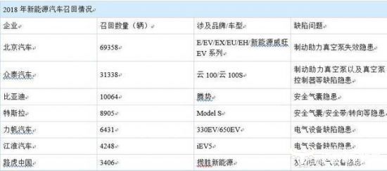 除了投诉记录外,在2018年新能源汽车召回排行榜上,北汽新能源也傲居榜首,全年累计召回6.94万辆。其中召回车辆包含了2012年2月28日至2018年5月8日生产的部分E、EV、EX、EU、EH、新能源威旺EV系列纯电动汽车,车型牵连程度显而易见。