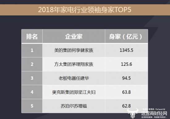 近日,运营商财经网发布了《2018年度家电行业研究报告》(简称“报告”),分析了2018年一年来家电行业的运行情况。在报告中运营商财经网统计了去年家电行业领袖身家TOP5,美的集团何享健家族以1345.5亿元的超高优势,拿下家电行业“最有钱领袖”的称号。
