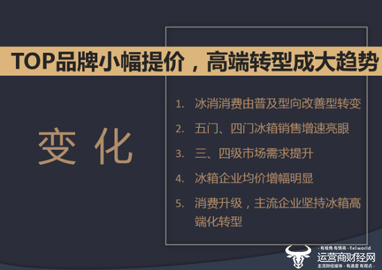 近日,运营商财经网发布的《2018年度家电行业研究报告》(以下简称“报告”)显示,2018年冰箱市场的最大变化为TOP品牌小幅提价,高端转型成大趋势,具体表现如下: