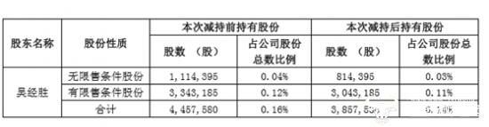 截止本公告披露日,公司高级管理人员吴经胜持有公司 3857580 股 A股,占公司总股本比例 0.14%,其中无限售条件流通股为 814395 股,限售股为3043185 股。