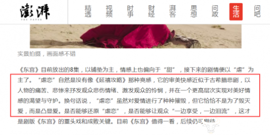 “它的审美快感近似于古希腊悲剧,以人物的痛苦、悲惨来抒发观众悲伤情绪、激发观众的怜悯,并在一个更高层次实现对美好情感的渴望与守护。” 日前,《澎湃》发表评论文章,如此分析《东宫》,“虽然对爱情进行了种种摧毁,但它恰恰不是为了毁灭爱,而是凸显爱。”