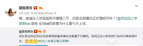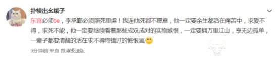 “《东宫》必须BE(Bad Ending,悲剧结局)!”大量网友在社交媒体上喊话《东宫》编剧。2月17日,#希望东宫男主孤独终老#的话题登上微博热搜,同时登上榜单的还有#白眼狼李承鄞的自画像#,同样是嘲讽男主即将出现的背叛。而关于剧情走向,原著作者匪我思存曾在微博给出暗示,“虽然开播情人节,但是全部播完正好清明节”。