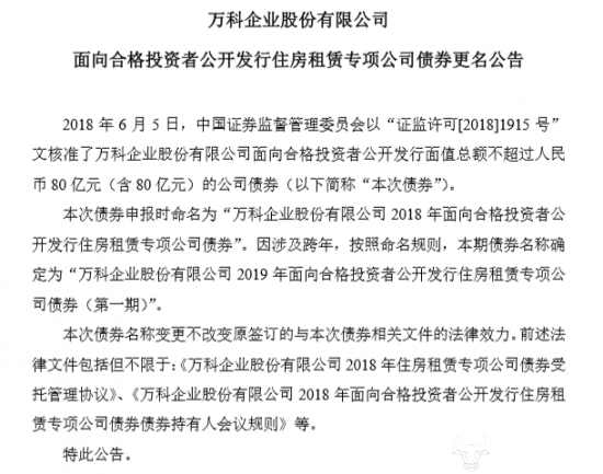 2月21日,万科企业发布面向合格投资者公开发行住房租赁专项公司债券更名公告。