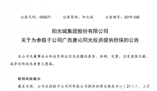 2019年2月21日,阳光城集团股份有限公司(简称“阳光城”)发布关于为参股子公司广西唐沁同光投资提供担保的公告。