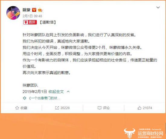 2月1日,咪蒙就《寒门状元之死》一文在微博道歉信,表示从2月1日开始,微信公众号停更2个月,微博永久关停。“咪蒙”微博账号如今也只剩这一条道歉微博。