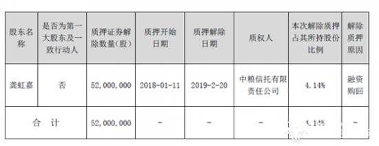 公告称,海康威视于2019年2月21日收到股东龚虹嘉的函告,获悉其所持有的部分公司股份解除质押,具体情况如下: