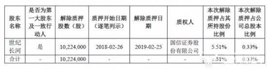 世纪长河持有公司股份18563.8793万股,占公司总股本的5.95%。完成本次部分股份解除质押登记手续后,世纪长河累计质押本公司股份11601.60万股,占其所持有本公司股份比例的62.50%,占公司总股本的3.72%。