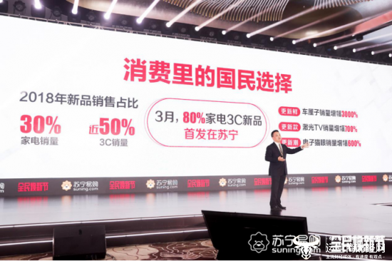 据苏宁大数据,新品在拉动消费上功不可没,2018年苏宁家电新品销量占比达30%,3C产品的新品销量占比接近50%。