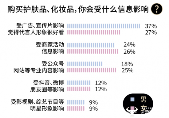 在坚持护肤的男性中,有近四成用户收到广告、宣传片或者代言人影响。所谓男性下单靠广告、女性下单看疗效。而在商品购买上,63%的男性是按照实际需要,用完了再置办新货。而女性的消费观念则不一样,有超过30%的姑娘喜欢先囤着。
