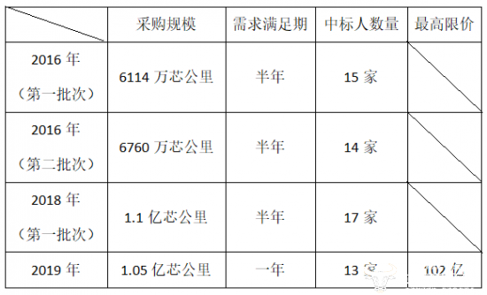 据了解,本次预估采购规模约为331.20万皮长公里(折合1.05亿芯公里),预计采购需求满足期为一年。按照招标书,本项目采用份额招标,中标人数量为10至13家,最高投标限价约为102亿元。