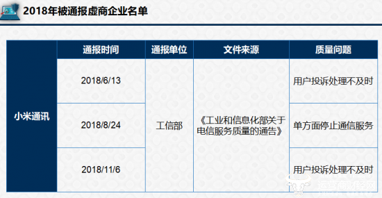 榜单显示,小米通讯在2018年被通信部《工业和信息化部关于电信服务质量的通告》中通报三次,其中两次都是因为用户投诉处理不及时而被点名,分别在2018年六月和十一月,另一次是在八月因单方面停止通信服务而被通报。