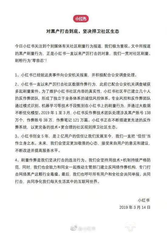 2019年1至3月,小红书反作弊技术团队处理涉及黑产账号138万个,作弊账号38万,作弊笔记121万篇。小红书正在不断搭建更先进的反作弊系统,以更完备的技术+更合理的社区规则捍卫社区生态。