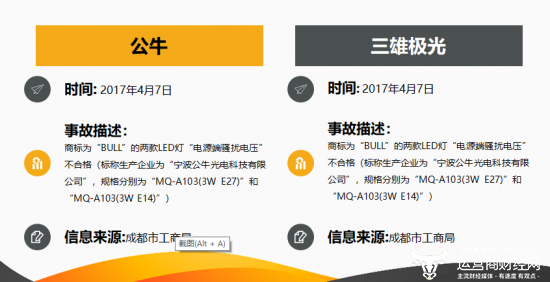 2017年4月7日,经成都市工商局通报,商标为“BULL”的两款LED灯“电源端骚扰电压”不合格(标称生产企业为“宁波公牛光电科技有限公司”,规格分别为“MQ-A103(3W E27)”和“MQ-A103(3W E14)”)。