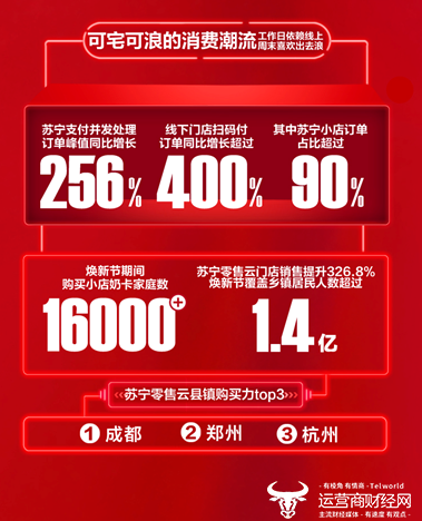 焕新节期间,任性贷新增用信交易环比增长109%;苏宁支付并发处理订单峰值同比增长256%,线下门店扫码付订单同比增长超过400%,其中苏宁小店订单占比超过90%;苏宁延保销售同比增长300%。
