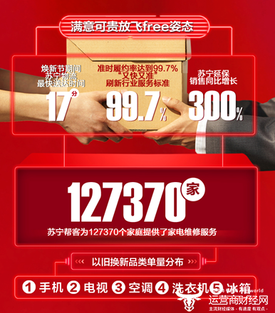 焕新节期间,苏宁易购物流订单最快17分钟完成送达;准时履约率达到99.7%,“又快又准”刷新行业服务标准;大家电送装一体服务,扩展至全国148个城市。