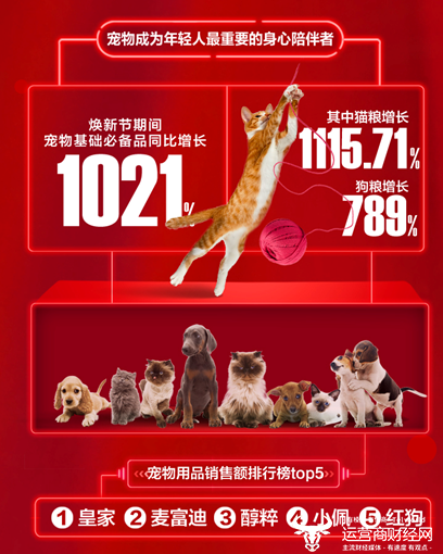 315全民焕新节,铲屎官们也没忘记家里的“主子”。数据显示,截至3月15日18点,宠物基础必备品同比增长1021%。其中猫粮增长1115.71%,狗粮增长789%,皇家、顽皮成铲屎官最爱的宠粮品牌。
