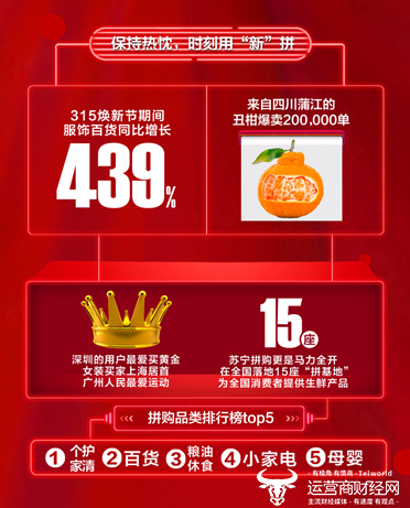 315全民焕新节期间,苏宁拼购在全国落地15座“拼基地”,为消费者提供生鲜产品。截至3月15日18点,来自四川蒲江的丑柑成为爆款,共计售出超20万单,湖北荆州大米售出12多万单。今年3月底,苏宁拼购将再新增5座“拼基地”,补强生鲜供应链。