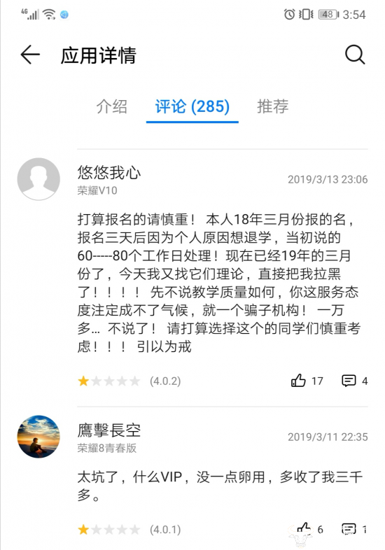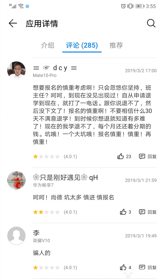 在“尚德机构”APP的评论里,有用户表示,“想要报名的慎重考虑啊!只会忽悠你坚持,班主任?呵呵,到现在没见出现过!自从申请退学到现在,就打了一电话。跟你说退不了,然后没下文了!报名的慎重啊!不要相信什么30天不满意退学!到时候你想退就知道有多难了!现在的我学退不了,每个月还还着分期的钱。坑哦!一个大坑哦!报名慎重!慎重!再慎重!”而有这样经历的不在少数。