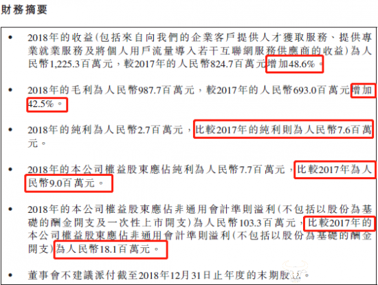 从猎聘财报的来看,其对于业务增长的部分会用百分比的方式与2017年进行比较,而对于减少的业务,则是简单说明比较2017年,无百分比。例如,对于毛利的描述是“2018年毛利为人民币987.7万元,较2017年的人民币693百万元增加42.5%。”对于纯利的描述则是“2018年纯利为人民币2.7百万元,比较2017年的纯利则为人民币7.6百万元”,似乎在避开业务下降的部分,有美化财报之嫌。